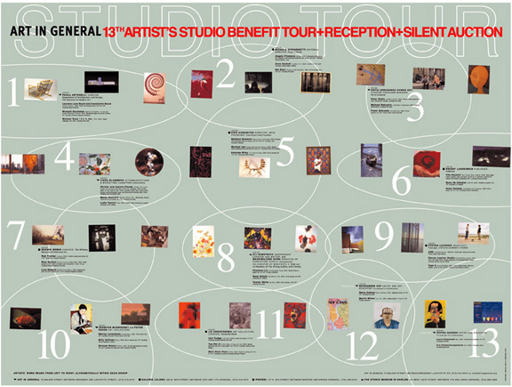 Poster promoting NYC artists' studio tour. The challenge was to show art and info for all 13 tours, with 2-3 artists per tour. Printed metallic silver with 4-color. (Art in General, a non-profit arts organization)
