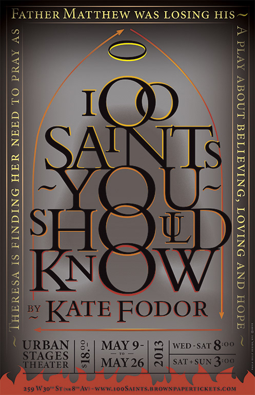 Art direction and design for Off-Broadway production, in NYC's theater district. Custom typographic treatment for titling (alludes to the church, heaven, hell and questioning religion). A dramatic play about an atheist single mother who is finding the need to pray, as a priest is losing his faith. (http://egoactus.com/100saints.html)